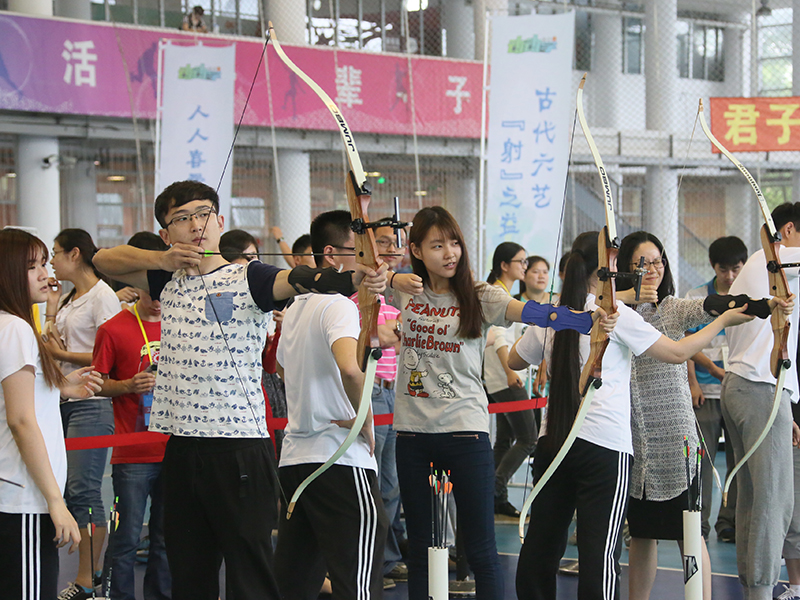 本次射箭体验活动体验区设置了8个靶位,为每位师生安排了专业人员负责手把手指导如何握弓、搭箭、开弓、放箭等一整套基础的射箭动作,确保活动安全。现场还设置了弓箭箭种展览,在此区域可看到不同用途的箭种分类,了解弓箭的相关知识。活动前还邀请到上海仁弓堂射艺队为师生带来传统弓箭的射艺,以及射箭不同阵仗和射姿变化的展示,现场展示古老的传统弓射箭技艺,让在场师生对射箭运动有了更加直观的感受。