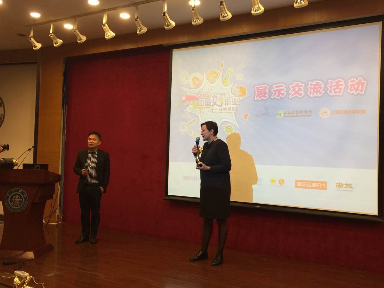 (图:“中国好作业”公益活动颁奖现场,我校导师代表,上海国际时尚创意学院学术副院长Helena教授、副院长李峻副教授为获奖学生颁奖)