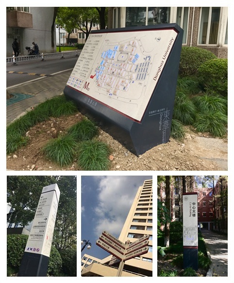 日前,延安路校区校园导视系统基本建成并投入使用,为师生及访客提供清晰连贯的导视信息。几种东华元素巧妙地融入在导视设计当中,令大家耳目一新。