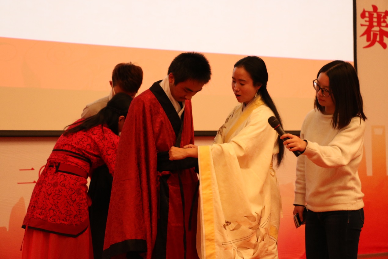 在互动环节中,胡英霞邀请4位同学试穿不同形制的汉服,示范穿法并讲解汉服穿戴的注意事项。另外还讲解了三种对长辈、同辈的揖礼,以及长辈还礼的步骤并做演示。汉未央文化促进中心汉舞教师阿珍为现场师生带来了精彩的汉舞表演,现场师生参与了“投壶”游戏,整场讲座“听、演、互动”相结合,给大家带来了视觉和听觉的多重体验。