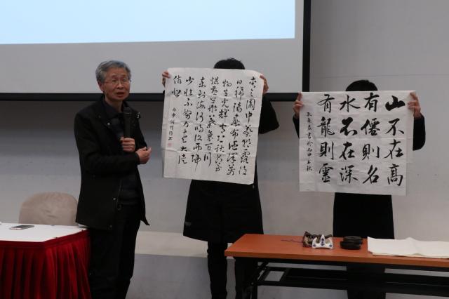 讲座的互动环节,路老师对我校书法爱好者的作品进行了精彩点评,并耐心回答大家提问,使大家对书法知识有了全新的认识。讲座为我校书法爱好者创造了交流、学习、提高的机会,同时也让大家领略了书法的特有魅力。