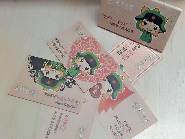 学雷锋还体现在身边的“小事儿”上。如图书馆、教学楼前面的雨伞架,校园环路、栏杆、停车场上下行台阶处上所贴的“LightBar”安全夜行反光纸,以及教室门口张贴的课表……小小的举动,到处透出暖暖的爱和温馨。