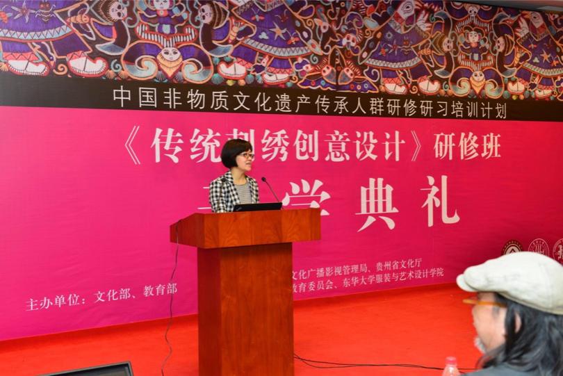 4月18日,我校首期中国非物质文化遗产传承人群研修研习培训计划《传统刺绣创意设计》研修班在延安路校区举行开学典礼。校党委副书记刘淑慧,上海市文化广播影视管理局公共文化处(非遗处)处长杨庆红,贵州省文化厅非物质文化遗产处副处长李安鹏,服装与艺术设计学院党总支书记袁孟红、院长李俊、副院长冯信群等莅临典礼现场,参与此次研修班的教师代表及全体学员参加典礼。