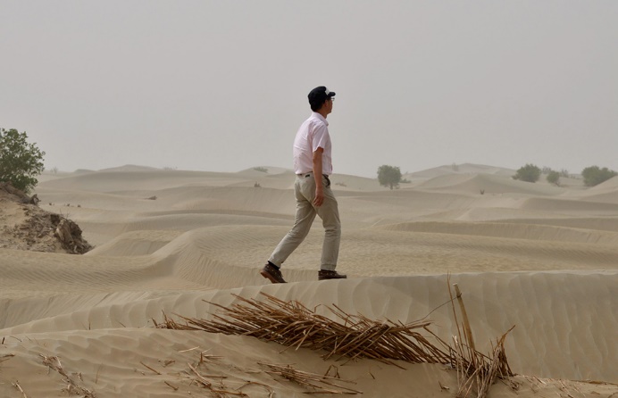 世界第二大沙漠,塔克拉玛干沙漠边缘。刚在“沙漠大学”塔里木大学会师的百人团,就被邱夷平拉到一处弃用营地,挖地三尺的“地窝子”前。烈日狂沙下,他指着木头牌坊上红五星旁的“屯垦戍边”字样,告诉列队团员们:这些还是条件比较好的地窝子,原来的天窗哪有玻璃啊!