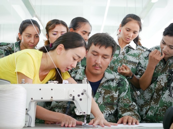 援疆团为新疆瑞博服饰公司新员工讲授新型缝纫机操作。