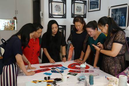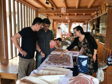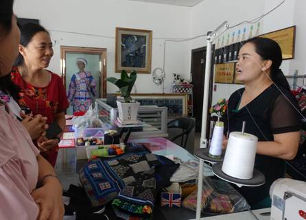 学员陈梅(右二)给回访工作组老师介绍设计新品