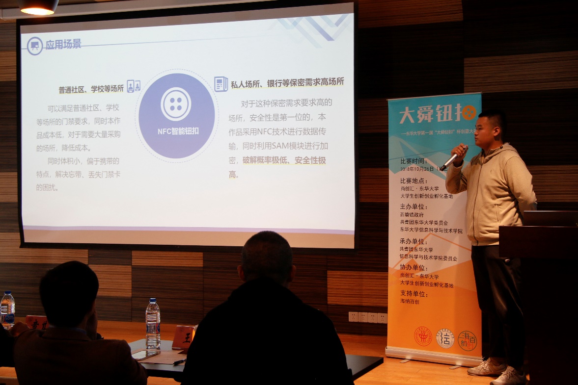 经过激烈角逐,来自信息学院姚祎威团队的《创意解压钮扣》和高山川团队的《基于NFC技术的智能钮扣门禁系统》荣获一等奖,机械学院徐少东团队的《“西”式钮扣》、服装学院侯海芹同学的《iButton可拆卸式钮扣》、纺织学院李建娜团队的《钮扣的新衣,你我的心意》和信息学院胡启明团队的《安全定位保障平安服务扣》荣获二等奖,材料学院冯国峰团队的《柔性荧光钮扣》、信息学院杨寅团队的《流云扣》、计算机学院贾琪团队的《小钮扣的大世界》和来自嘉善西塘的和强实业有限公司林明敬团队的《O型注塑调节扣》荣获三等奖。