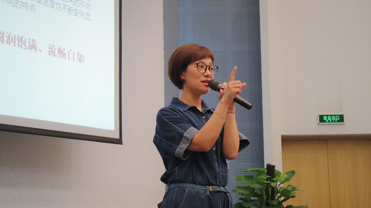 讲座中,李欣向大家分享了自己的成长生活环境和播音主持经历。结合“东华朗读者”提交的互动作品,向同学们传授朗诵技巧,并针对同学们的现场朗诵逐一点评。她认为个人经历和情感体会对朗诵尤为重要,并从听力、语音发音、情感表达“一点两线”等方面向在座师生系统介绍了朗诵技巧,通过张家声、曹灿等著名演播艺术家的原声再现进行案例分析,帮助大家理解和体会朗诵技巧的应用。