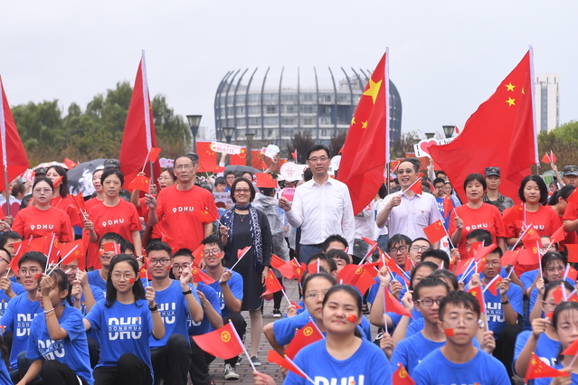 活动现场,七十位青年团员组成创意造型“70”,向祖国母亲“花式表白”,献礼新中国70华诞。现场气氛在全场合唱《歌唱祖国》、《我和我的祖国》的嘹亮歌声中达到高潮,全体师生用饱含深情的歌声共同展现了东华人的坚定信念和价值追求。