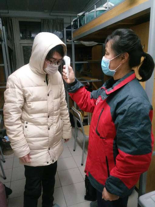 2月9日上午,延安路校区第三宿舍值班员刘爱娣、汤正兰在为同学们测量体温时,发现一位男生体温异常。在两位宿管阿姨的再三叮嘱下,同学来到校医院排查,测量体温正常后返回宿舍。下午,值班阿姨不放心这位同学的身体状况,再次为他测量体温,当看到体温枪上的数字“37.5”时,阿姨们不敢怠慢,一边提醒男生就诊,一边向学校、学院及相关部门汇报。直到后来诊断为普通肺炎,服药调理即可,大家悬着的一颗心这才放下。