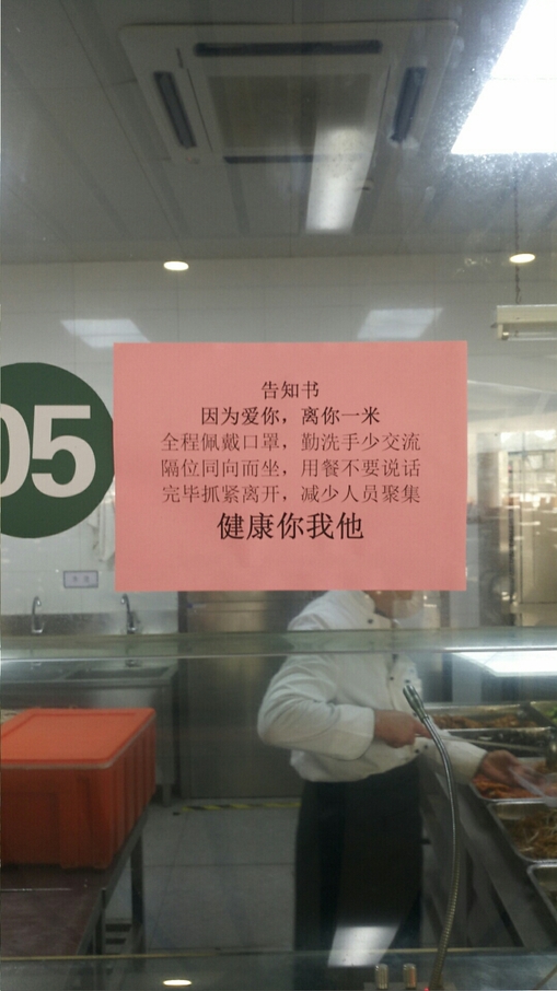 “因为爱你,离你一米”“全程佩戴口罩,勤洗手少交流”“隔位同向而坐,用餐不要说话”,如此暖心的告知书,在食堂窗口前随处可见,时刻提醒就餐的师生员工养成良好的就餐习惯,减少聚集。配备消毒杀菌的洗手液,专设贴有标识的带盖回收垃圾箱以供大家丢弃废弃口罩、手套,增加套餐盒饭供应,鼓励打包带回用餐等举措,最大程度防止用餐期间的交叉污染。工作人员按开餐前、开餐中及开餐后三个时段对餐厅进行全方位清洁、消毒、通风,确保就餐环境安全、干净、卫生。