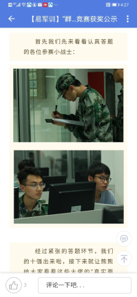 “稍息,立正!”口号洪亮有力、动作整齐划一,绿色的迷彩服成为新学期校园里的一道靓丽风景线。经历了疫情的“寒冬”后,19级本科生终于迎来了期待已久的军训集体生活。今年的军训是新学期思想政治教育的重要一环,结合常态化疫情防控要求,除了常规训练项目外,今年军训还增设了军事拓展训练营、军事大纲体验营及军事网络训练营,重点创新“云端”形式开启国防教育新篇章。学校依托易班网举办“笔扫千军,致家国情”军训三行情诗征集、“增强本领,锤炼品德”军训随手拍摄影大赛、“群雄逐鹿,易站到底”军事理论知识竞赛等线上国防教育活动,组织“风华正茂展英姿,乘风破浪正当时”文艺汇演直播、“和平精英演习”真人CS射击对抗赛,制作“军魂永驻,初心不改”系列军训视频特辑。军训期间,线上系列推送总点击率达5万余人次,评论量达8000余人次。通过军训国防教育,学生掌握了军训知识技能、培养了集体意识、磨砺了意志品格,并将带着这份坚定地信念和如火的热情开启新学期。