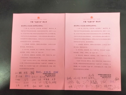 最后,学生党支部书记潘攀宣读“光盘行动”倡议书,号召全体党员共同为建设文明、和谐、环保的社会环境作出自己的贡献。全体党员纷纷响应号召,并在倡议书上签名。支部党员表示,“常将有日思无日,莫待无时当有时”,虽然现在生活富足了,但作为当代青年,仍要争做勤俭节约的传播者、实践者和示范者,树立崇尚节约的价值理念,在强化敬畏感中“立心、立规、立行”。