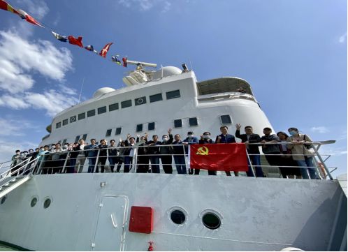 师生党员们登上相当于10层楼高的“远望1号”,跟随专业讲解在天线甲板、艏甲板、艉甲板驻足,在甲板上聆听叶剑英元帅的七律诗《远望》和远望号系列测量船的发展历史,在驾驶舱里近距离接触远望1号服役期间曾使用的科考仪器设备,详细了解救生艇、船用锚机等设备的用途,认真学习水手结打法以及救生衣使用等基本海上救生知识。党员们一边凝望着毛泽东同志题写的“远望”,一边抚摸着略显斑驳的扶手,眺望着浦江两岸,心中的激动之情难以抑制,仿佛回到了那个热血澎湃的年代,深切体会着巍峨船身承载的“奉献、团结、拼搏、严谨、开拓”的远望精神。