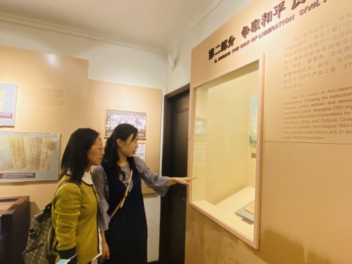 党支部同志们来到实物陈列前,用心仔细观看着油画雕塑和影像资料,学习抗战岁月、争取和平反对内战、里应外合解放上海的党史知识。遗爱般般在,勿忘缔造难,这是陈列的结束语部分,刘长胜故居中的共产党人书写的历史不能被尘封也不能被忘却。驻足细看,支部同志们不时探讨交流,纷纷表示党史是最好的教材,英雄先辈展现的共产党员的信念担当值得我们永远学习,作为高校思政教育工作者,我们更要在党史学习教育中走在前头,主动作为,更加坚定用党的创新理论武装头脑,培养堪当民族复兴大任的时代新人。
