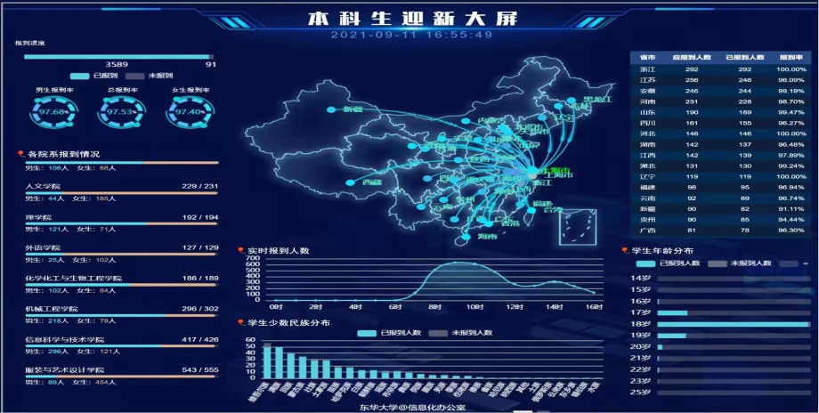 粉刷一新的大学生活动中心、焕发勃勃生机的中心大楼、醒目的横幅标语、飘扬的彩旗……即将迎来七十华诞的东华校园里处处洋溢着浓厚而热烈的迎新氛围,又一批怀揣梦想的青年学子将从这里起航。9月11日,3594名本科生和3065名研究生,从祖国各地汇聚到东华大家庭,开启他们的人生新征程。校长俞建勇,党委副书记刘淑慧,副校长陈革、舒慧生、李炜等校领导先后来到迎新第一线,在新生注册报到处、慈善爱心屋、新生宿舍、核酸监测点等处看望新生,亲切慰问迎新工作人员。