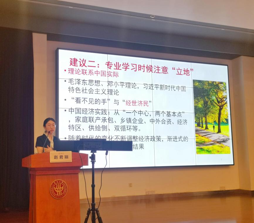 9月14日,学院党委委员、宏(微)管经济学领航团队党支部书记赵君丽老师,以《保持持续进步是一种能力》为主题,从党史学习教育经验体会出发,从“理论学习要注意‘顶’天”、“专业学习时候注意‘立地’”、“保持持续进步,不惧挫折,不懈努力”三方面跟新生进行交流分享,号召广大新生心怀理想、脚踏实地、努力奋斗。