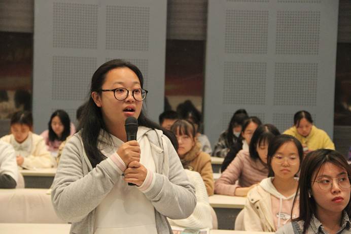 在提问环节中,同学们踊跃发言,碰撞出思维的火花。卞老师也耐心地为同学们解答疑惑。当同学们问及当代的国潮文化是否真正理解“中国传统服饰文化”的内涵时,卞老师提出要处理好传统与现代的关系,让两者相辅相成、相得益彰。这使同学们增强了对中国文化的认同感、归属感、自豪感,也认识到了要让中国文化走向世界、让世界了解中国文化。