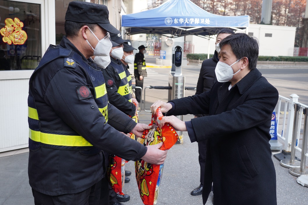 1月20日,党委书记刘承功,校长俞建勇,副校长陈革、李炜在两校区看望慰问春节留校学生及教职员工,检查寒假期间校园安全工作,相关部门负责人一同参加。