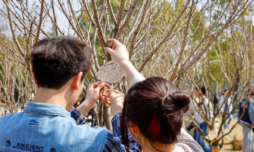 活动现场邀请了专业园艺师,为师生科普花木种植、树木修剪、草坪维护和移植加固的专业知识,讲解了关于生态环境保护的重要意义。现场热火朝天,挥锹铲土、扶树正苗、浇水培土,参加植树活动的师生在园艺师的指导下,完成了50棵樱花树的种植。在劳动实践的同时,写下春日的寄语并认领挂牌,亲手传递耕耘与感恩,体悟劳动的价值。