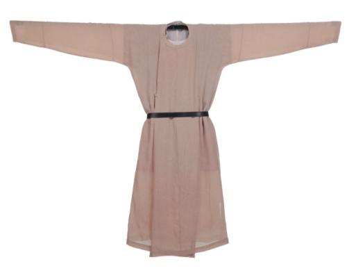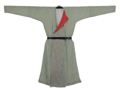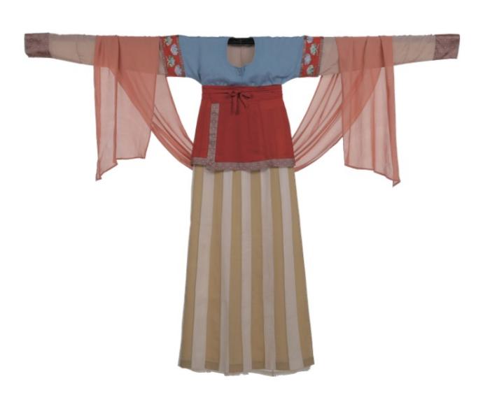 展出的三套女子服饰,展示了唐代女子服饰的流变过程。唐代女装的基本构成为裙、衫、帛。初唐女装上襦合身,裙子为高腰掩乳或高腰乳下、长裙及地的样式,如此着装显得简便干练。盛唐时期,女性风姿以健美丰硕为尚,这种新趋势反映到服装样式上,开始流行大髻宽衣。随着“褒衣博带”的华夏传统审美再次回归,服装款式日趋肥大,制作裙幅多、裙摆宽大曳地的裙子耗费奢靡,以至于政府不得不颁布政令加以约束,但收效甚微。
